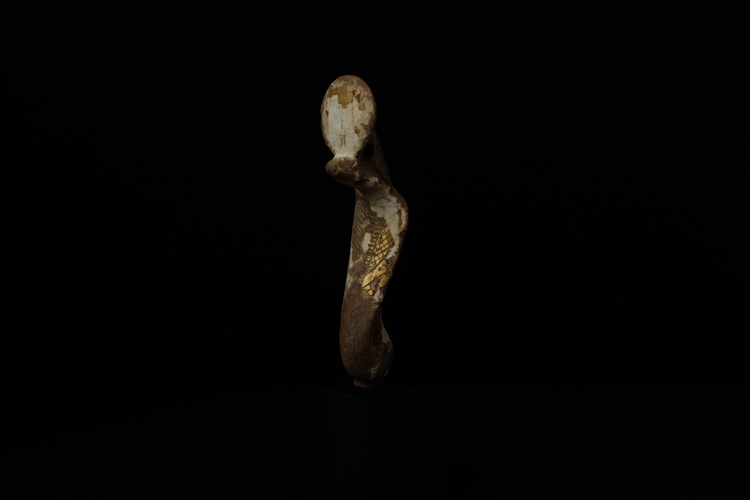 ウラエウスは立ち上がったコブラを様式化した記で、女神ウジャトを表し、王権の象徴でした。身体が半分で折り返され、頭上の太陽円盤の裏まで尻尾が伸びたような表現になっています。金箔が胸と円盤に一部残っています。家具あるい木棺の一部。木彫のウラエウスはかなり希少と思われます。