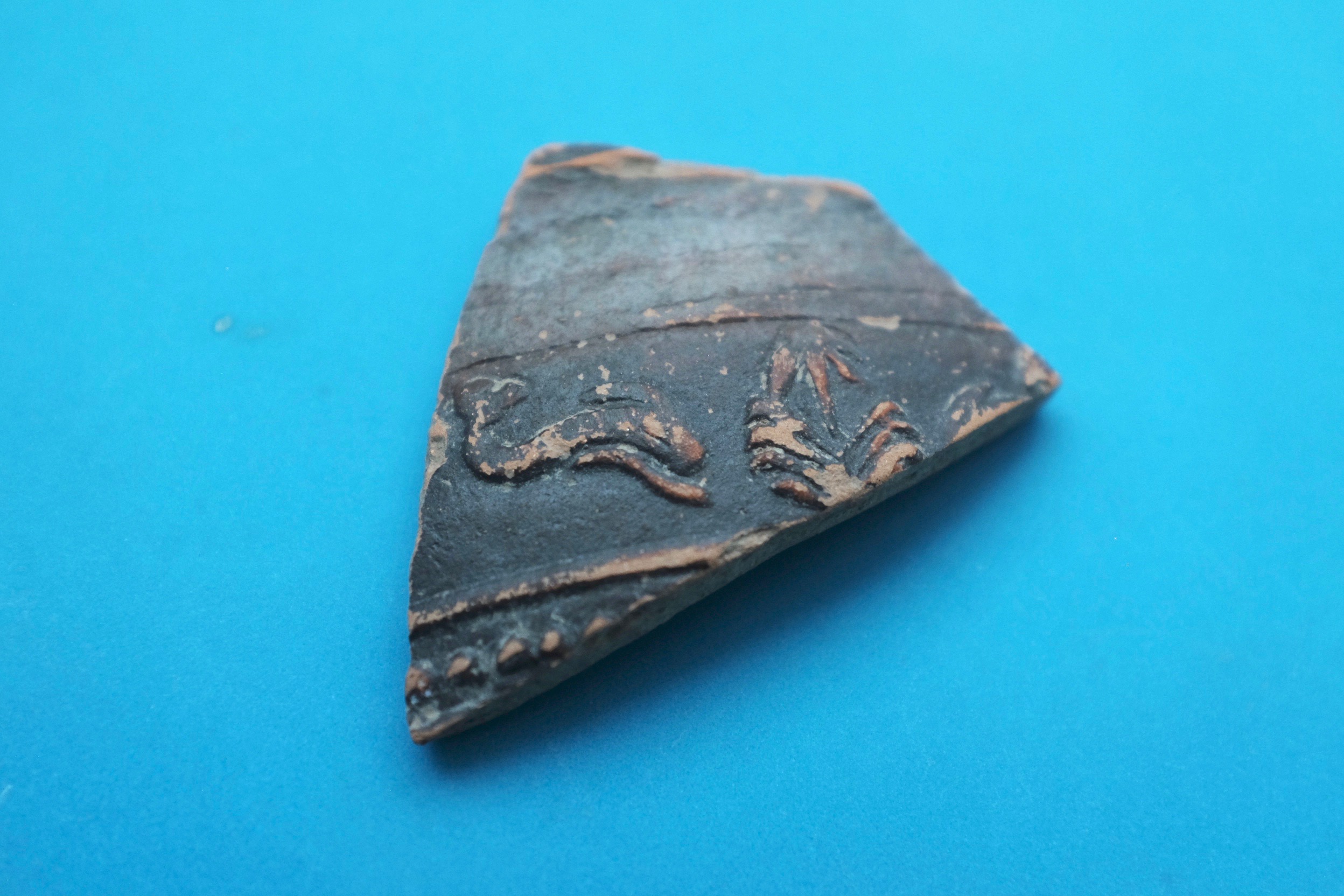 アッティカ(現在のアテネ)西のメガールで主に制作されていたことからメガリアンボウルと呼ばれるヘレニズム期のレリーフ陶器のカケラ。ローマ後期のテラ・シジラタのようにレリーフで立体的な柄が描かれ、多くの場合黒釉で仕上げられています。エトルリア、ギリシアの黒釉陶器からローマの赤色レリーフ陶器への過渡期の工芸。