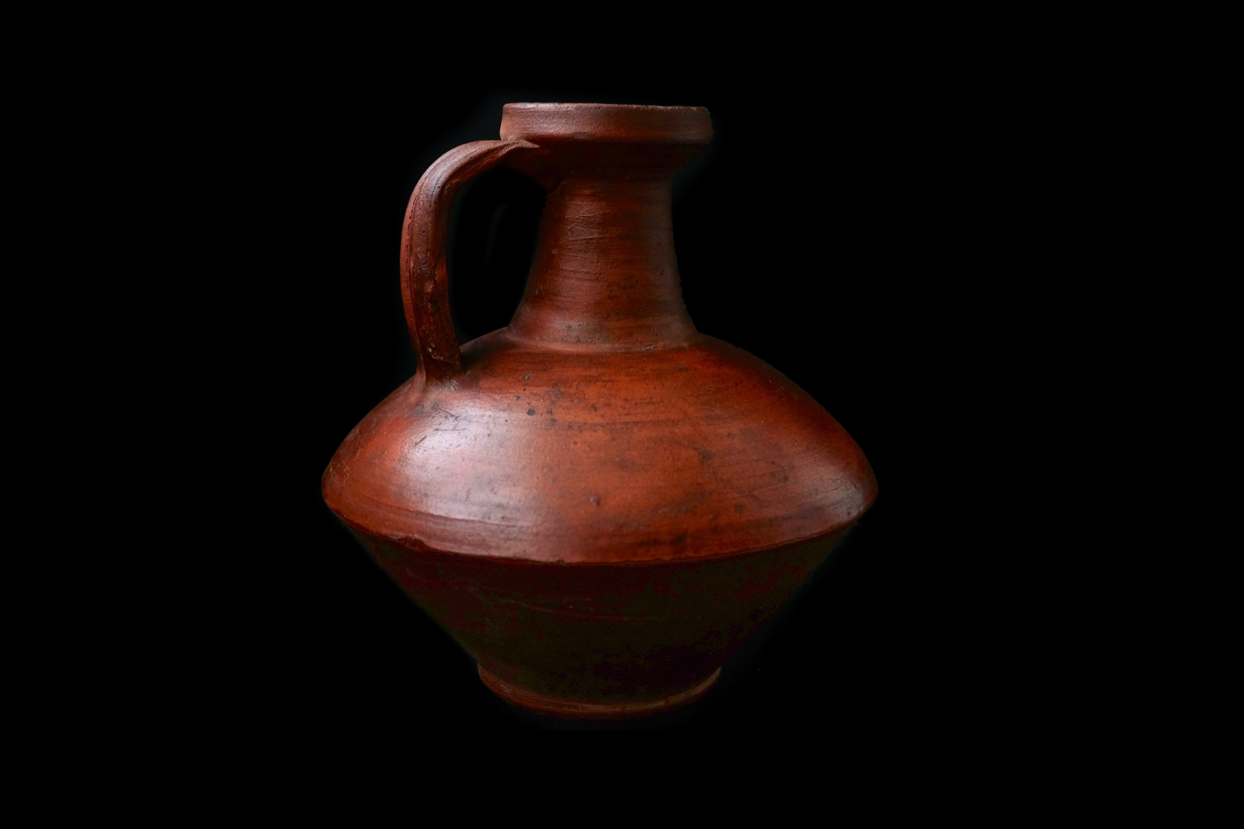 ラギノス(3-4世紀 ローマ/北アフリカ) 材質: テラコッタ サイズ: 高さ 18 幅 16cm 主にオイルが入れられていた長頸の壺。ローマ領の北アフリカで作られたスリップウェア。碗を逆さにしたようななで肩と直線のコントラスト。