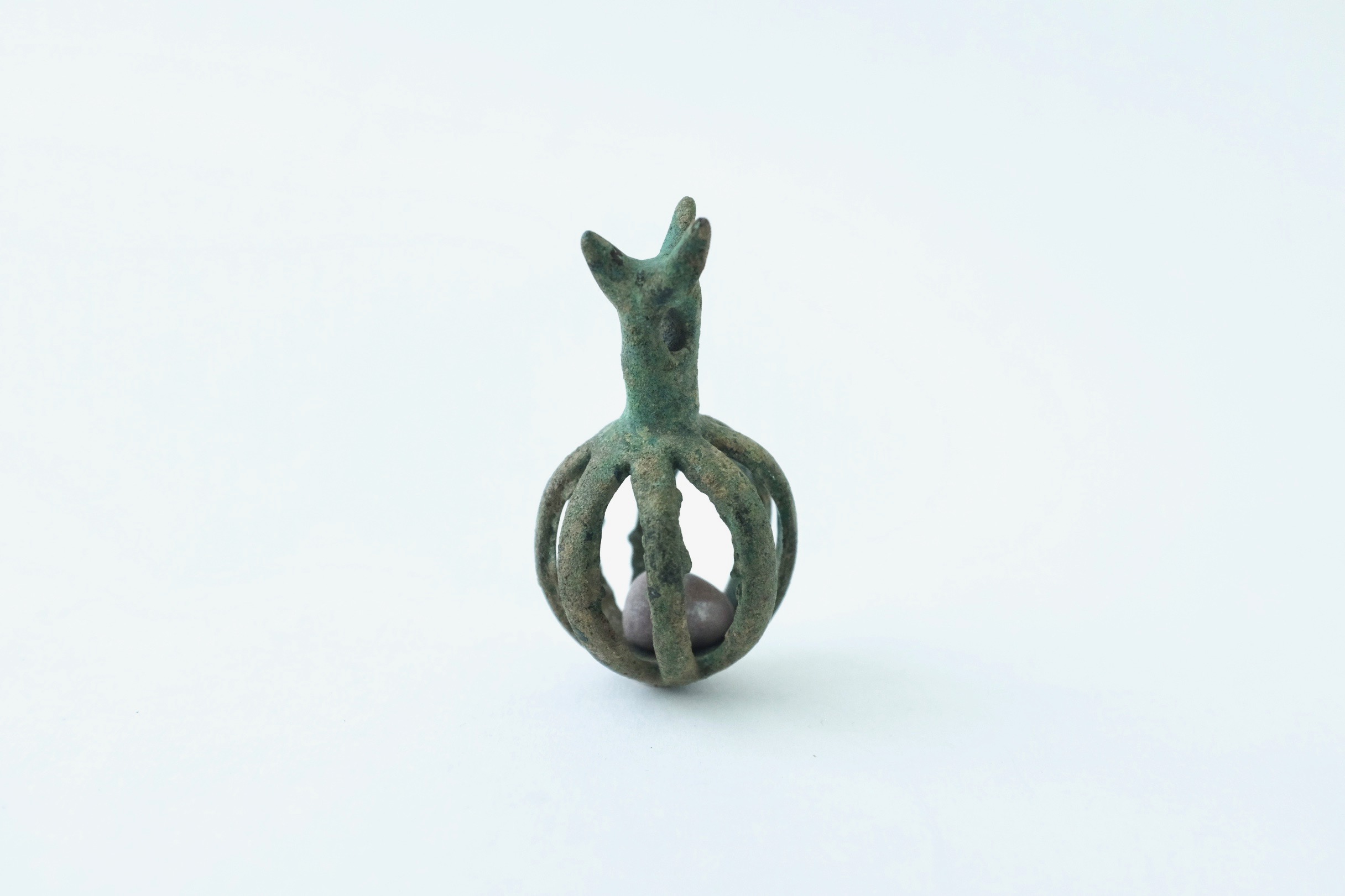 動物形鈴(紀元前15-10世紀 アムラッシュ (イラン)) 材質: 青銅 サイズ: 高さ 6 cm 犬のような顔がついた鈴。魔除けの類かと思われます。中に石の玉が残っている希少なコンディション。鳴ります。