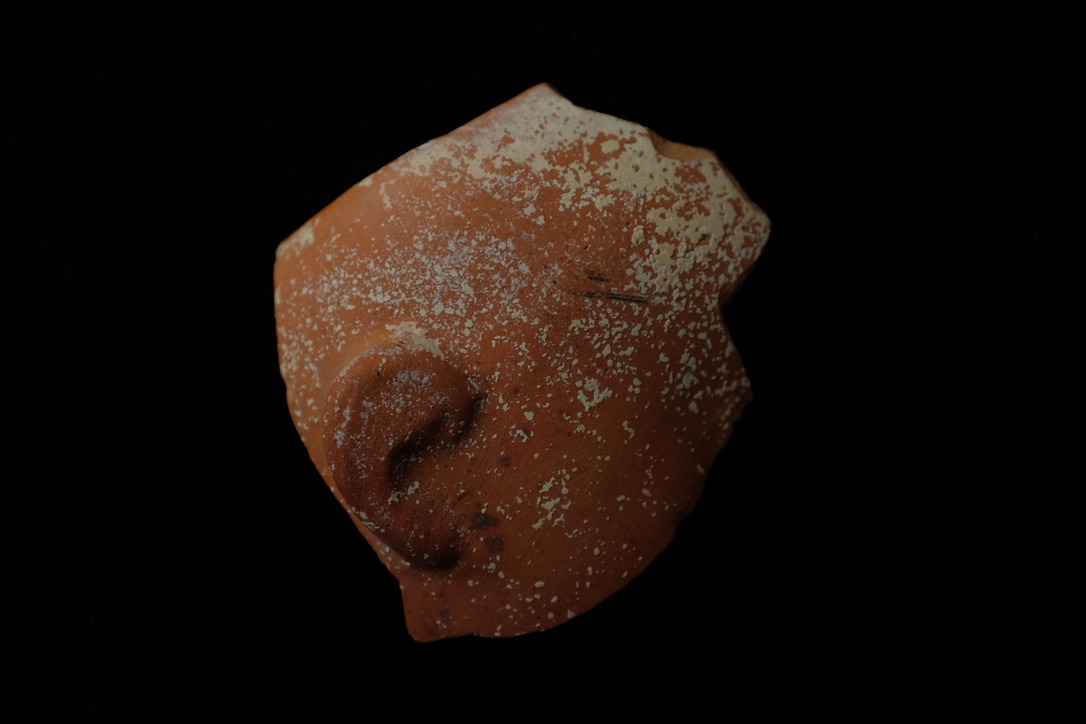 ご注文・お問合せはこちら ギリシア陶片(紀元前5-3世紀 黒海沿岸) 材質: テラコッタ サイズ: 高さ 6.5 幅 6cm 上部が平らに成形されているため、おそらく顔の形をした杯の一部。 価格: 22,000 円(税込)