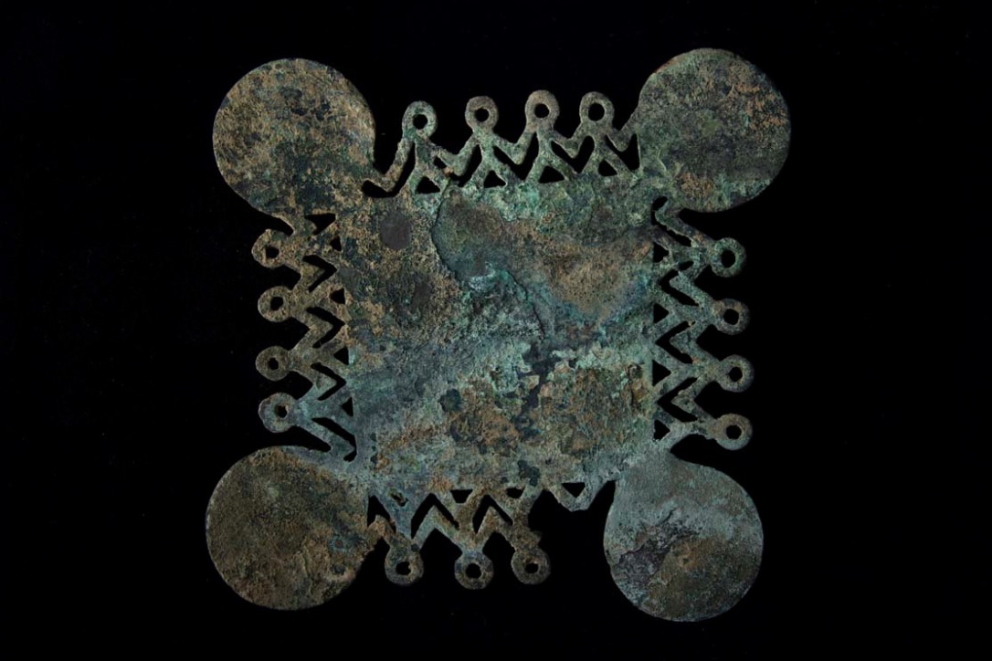 装飾板(紀元前1000年紀前半 イタリア/ギリシア(?)) 材質: 青銅 サイズ: 高さ 11 cm 人が手を繋ぎ、四隅の円へと繋がっています。宗教儀式を想像させる幾何学的表現。裏面に紐を通す環がついています。
