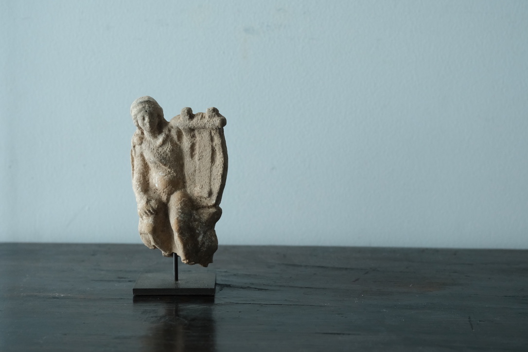 中性的な少年の姿で表されており、ボイオーティアのタナグラで製作されたものと考えられます。焼成前に塗られる白い塗料(泥漿)が少し残っています。