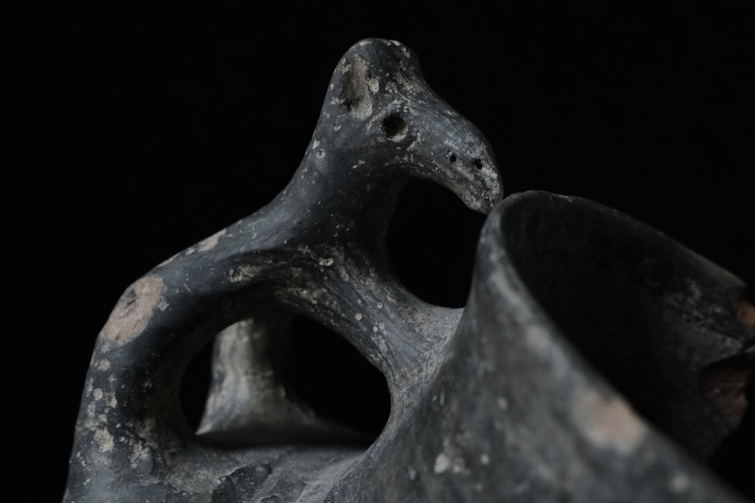 青銅製鍑(ふく)に動物の把手付いている例はよくありますが、土器に付いていることは稀。祭祀用の道具かもしれません。