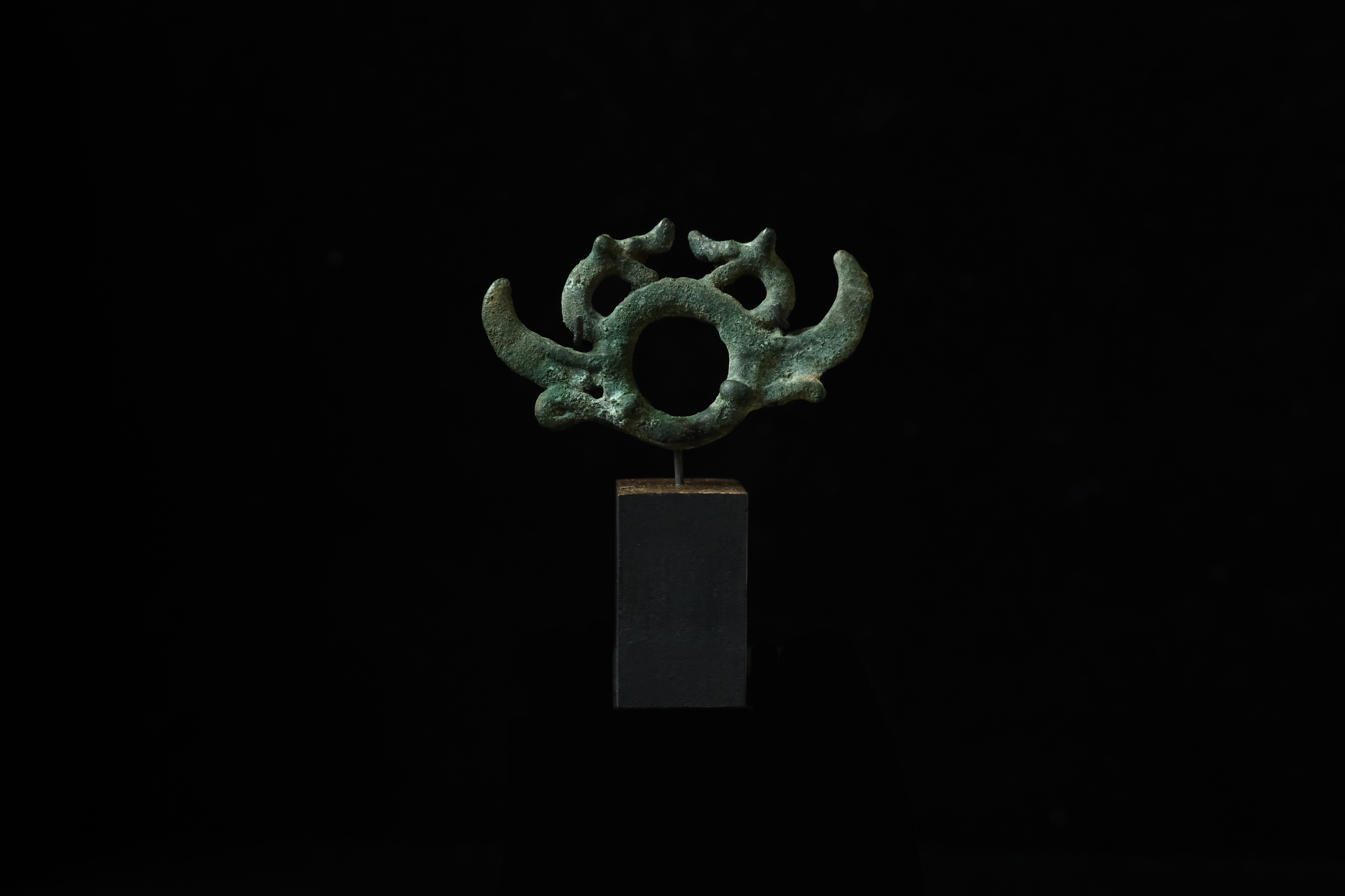グリフォンのような有翼獣が象られた環状金具。おそらく馬の飾り。立体的な顔はコーカサスやイランの表現に似ています。