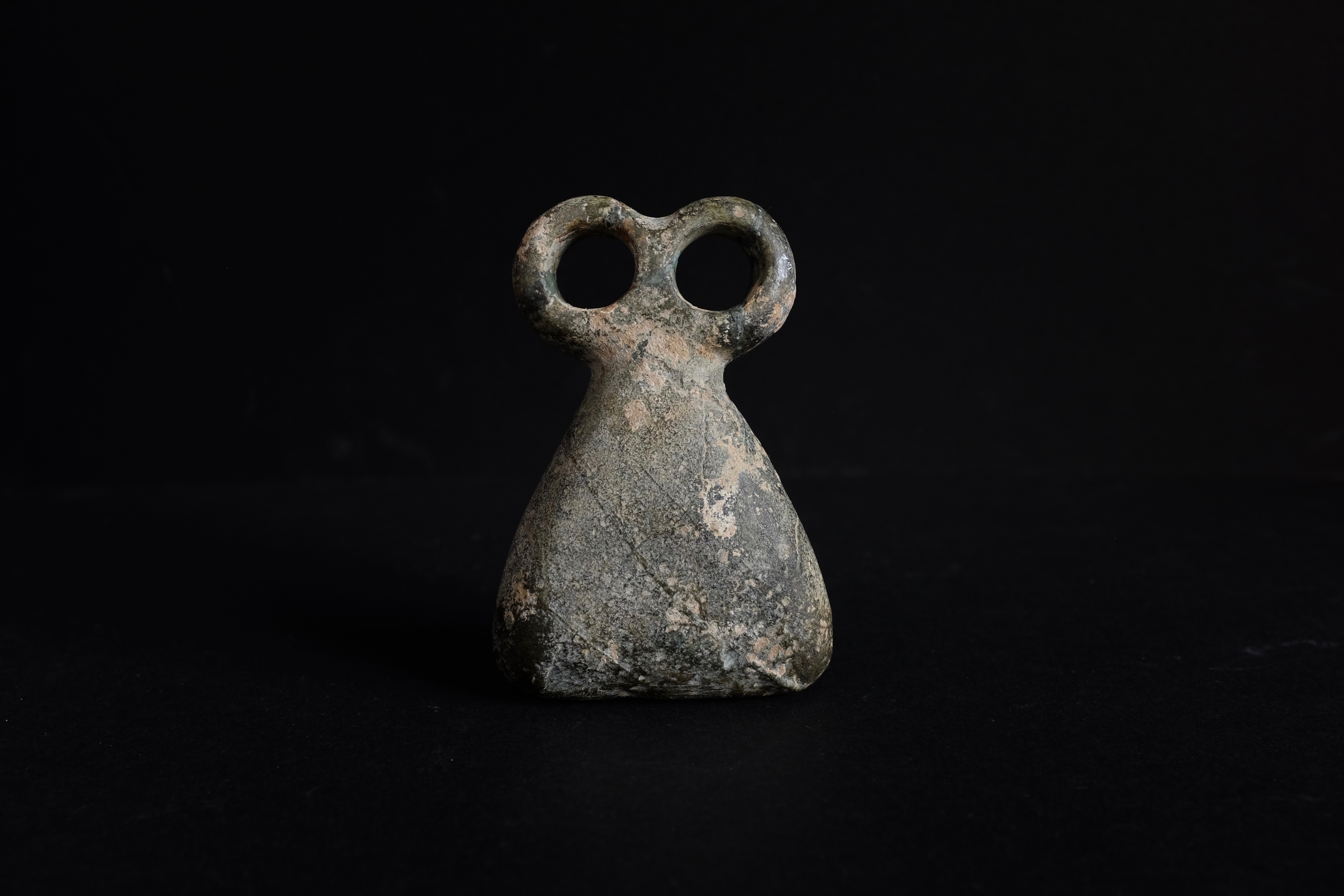 大きめな釣鐘形の眼の偶像。異界を覗き込むような大きな眼が穿孔されています。北メソポタミアで出土したもので、銅石器時代(青銅器時代以前)の宗教面を捉えられる可能性がある唯一の遺物とされています。